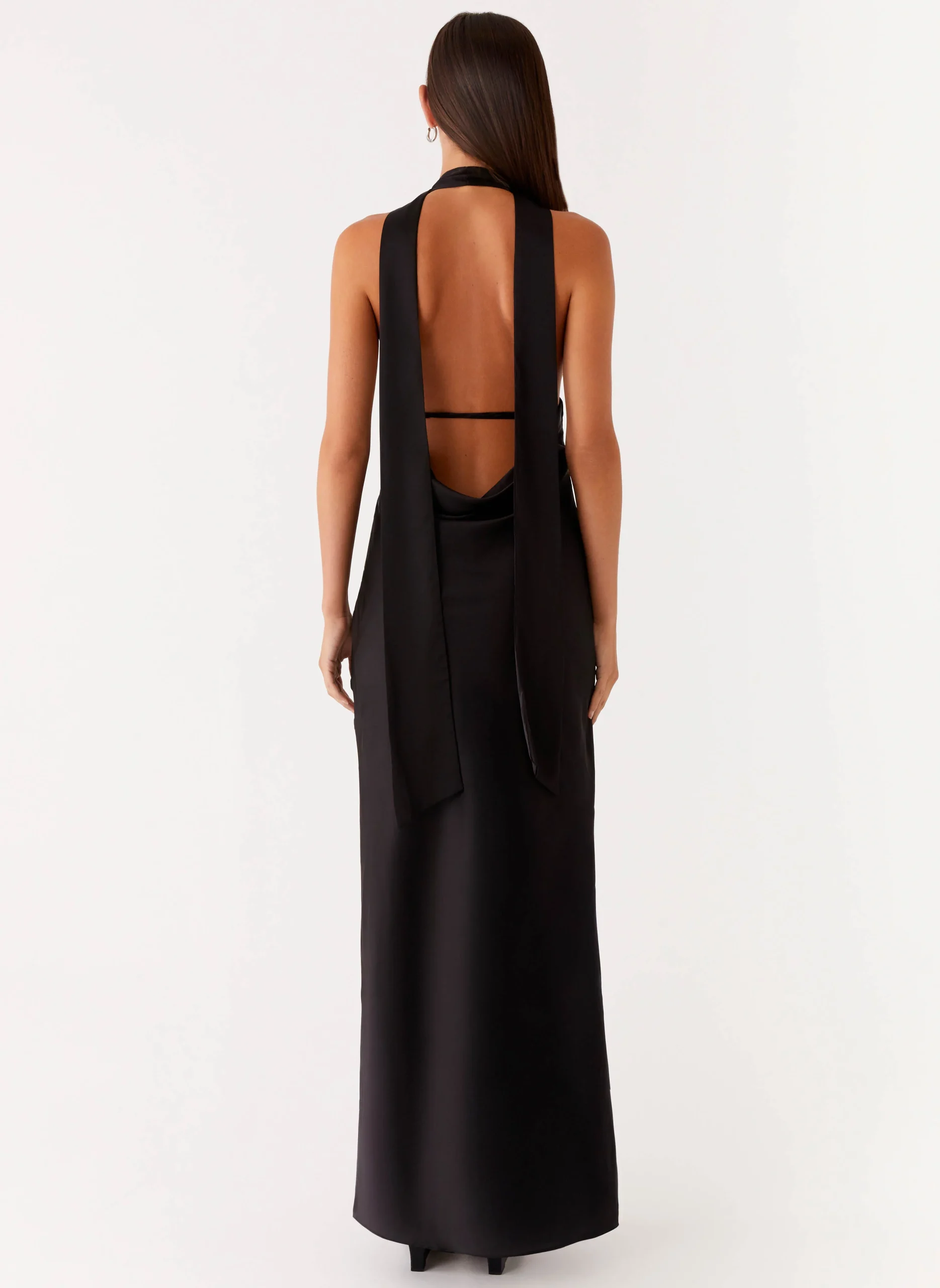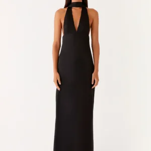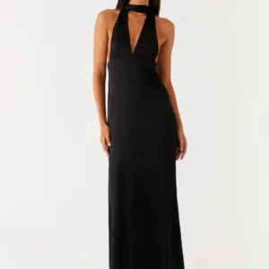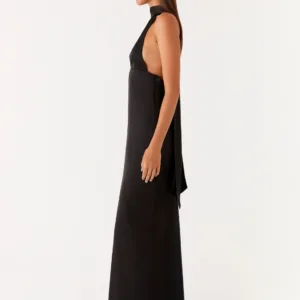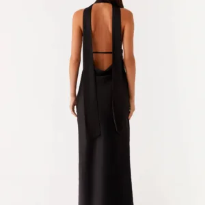This backless satin Alicia maxi dress is perfect for warm evenings with its low V-neck and flowing length. A thick neck scarf and thin adjustable straps frame the low back, while the satin fabric drapes smoothly over the fully lined skirt. It’s the perfect option for partying from dusk to dusk.