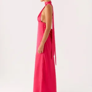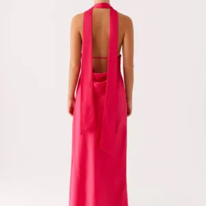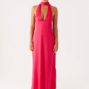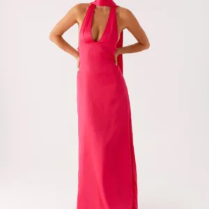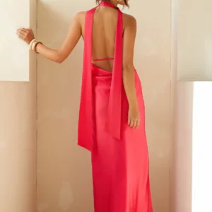 Luxurious and seductive, the Alicia halter satin maxi dress features a deep V-neck, a plunging back, and a wide scarf at the neck for a dramatic accent. Fully lined, it’s designed to shine all night long.