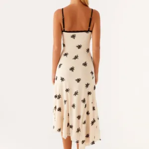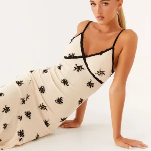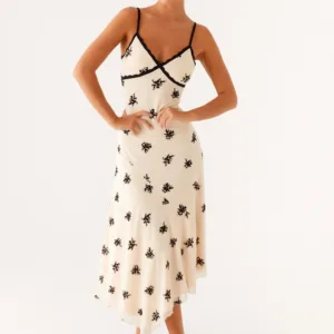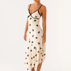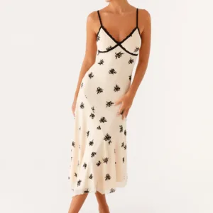 A Peppermayo exclusive, the Amelia midi dress exudes effortless elegance thanks to its stretchy fabric that moves with you. Fully lined for comfort, it’s adorned with delicate floral embroidery for a touch of romance. Perfect for any evening where grace and style meet.