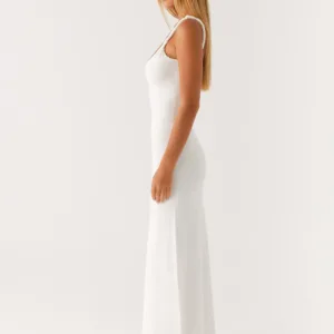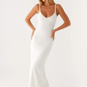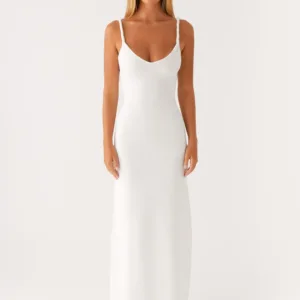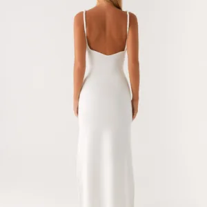 The Anastasia maxi dress features a dramatic low neckline and a bold open back, perfect for making a statement. The lack of lining emphasizes the fluidity and lightness of the fabric, giving the dress a relaxed yet elegant look.