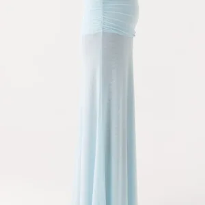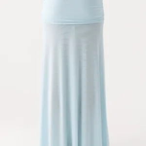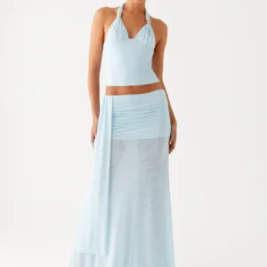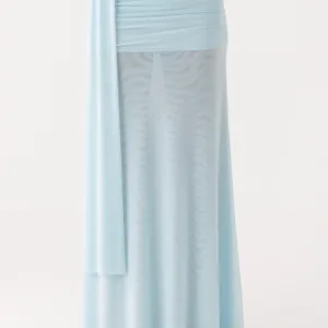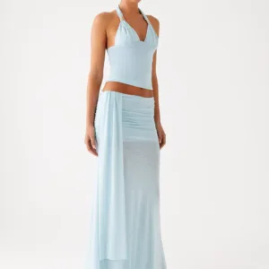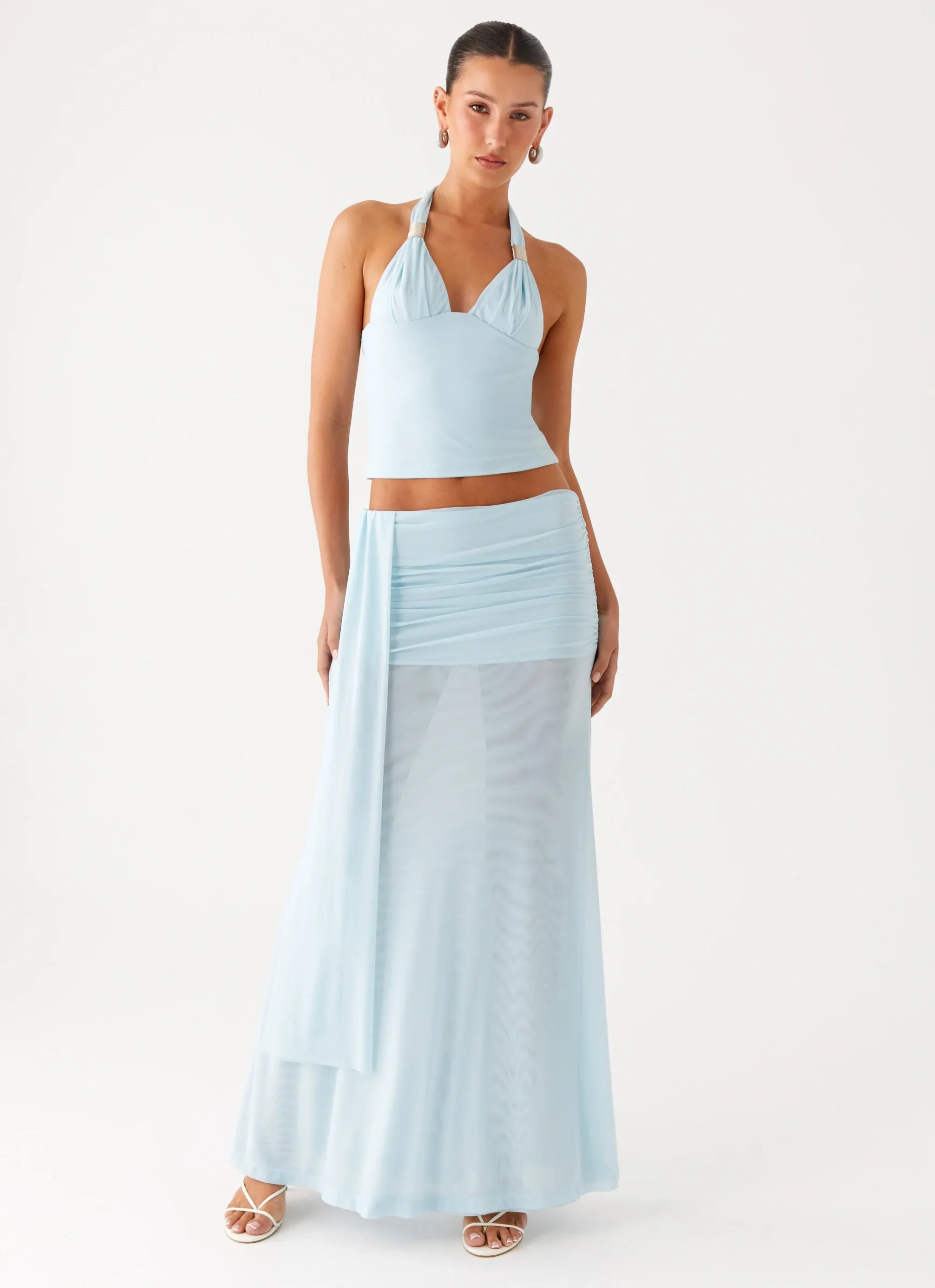 The Blaze Maxi Skirt is made for bold nights out and energetic looks. This stretch mesh maxi skirt features a low rise, gathered waistband, side tie, and is fully lined for a flattering silhouette in a soft blue hue.