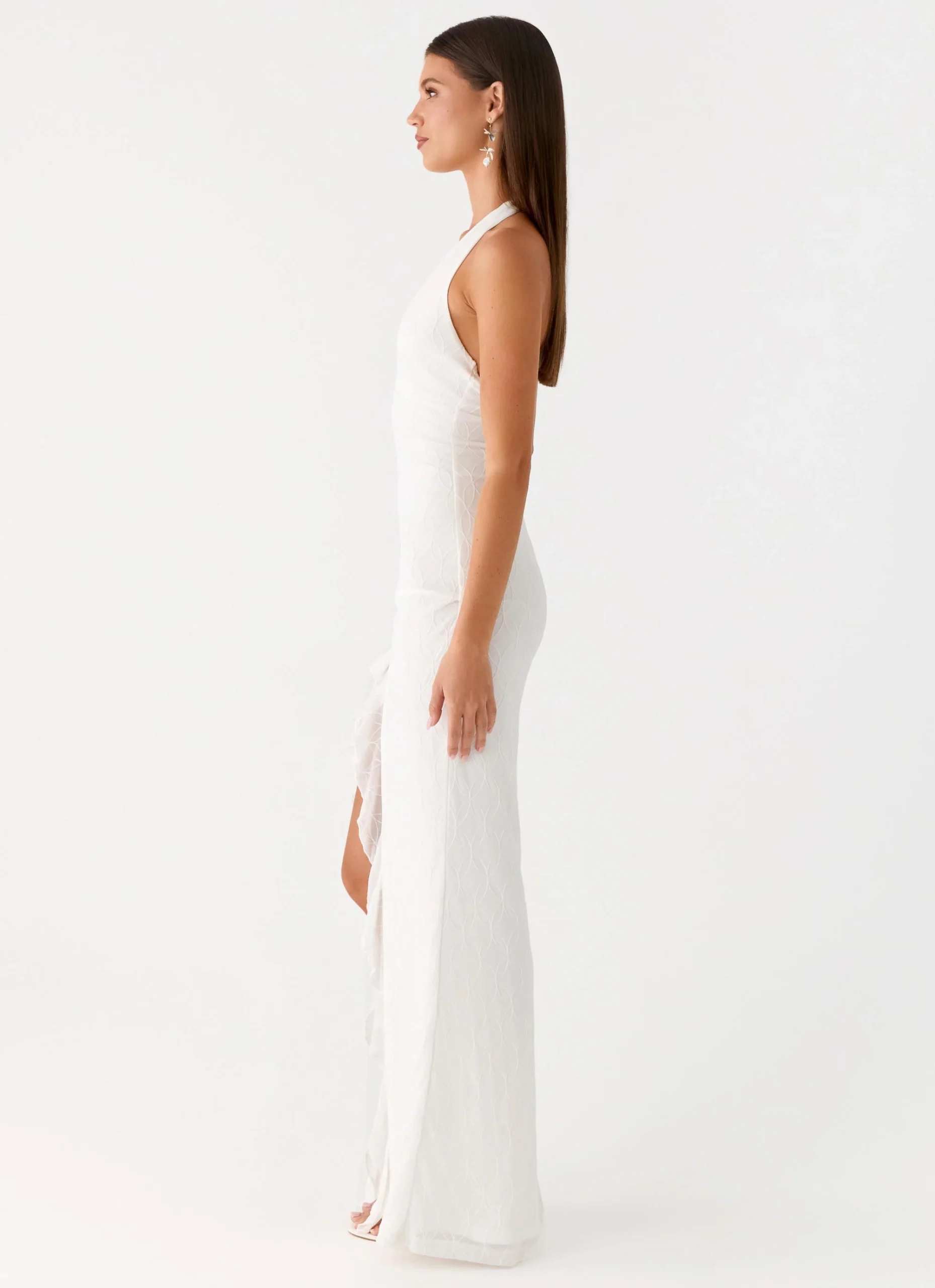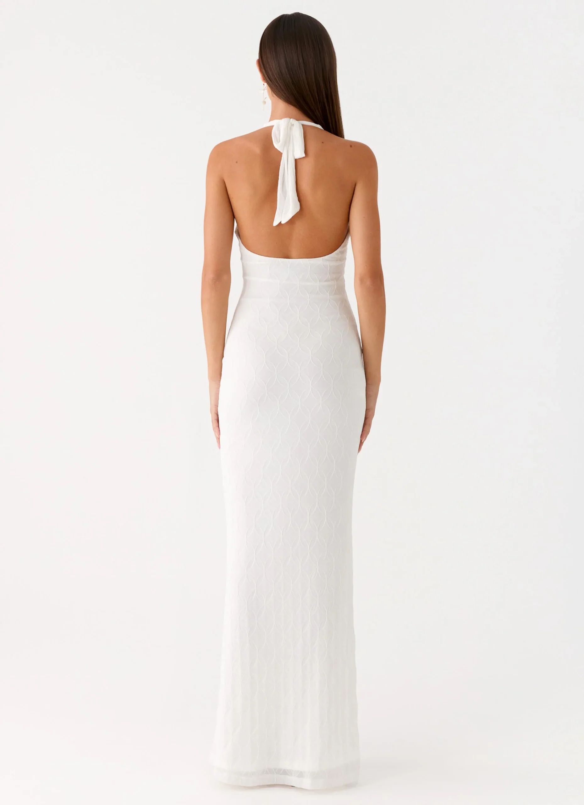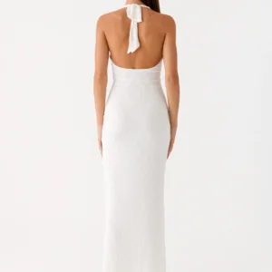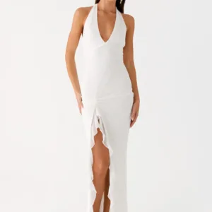 The Charmed By You Maxi Dress is a form-fitting dress with a low V-neck halter neck and stretchy textured mesh for a flattering fit. This dress is fully lined for comfort, with a high ruffled slit and an open back for added drama.