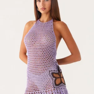 Introducing the crochet mini polo dress. With a striking halter neckline, stretchy knit fabric, and semi-sheer design, this dress effortlessly combines elegance and glamour, perfect for making a statement under the stars.