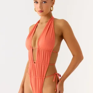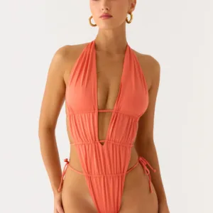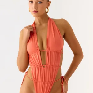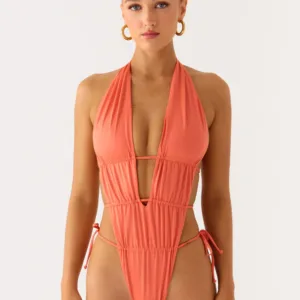 The Dandara Cut Out swimsuit is a striking halter-neck swimsuit with a keyhole front and intricate beaded embroidery on the front and straps. It features a low back, side cutouts, side ties, and is fully lined for comfort and support. Each piece features an exclusive print, the placement of which is unique to each garment.