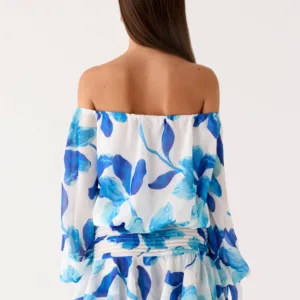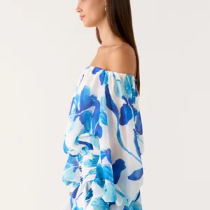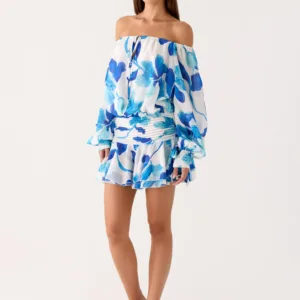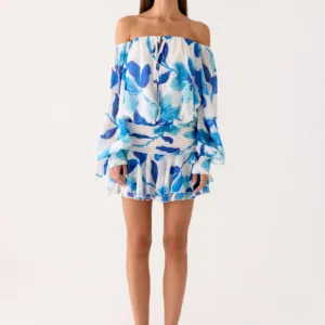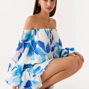 The Eira balloon sleeve mini dress is a playful and flirty choice for warm days and evenings. Featuring an off-the-shoulder design, a tie front, elastic panels, and a fully lined silhouette, this mini dress combines style and comfort. A ruffle hem adds movement and a playful, feminine touch.
