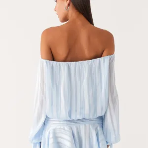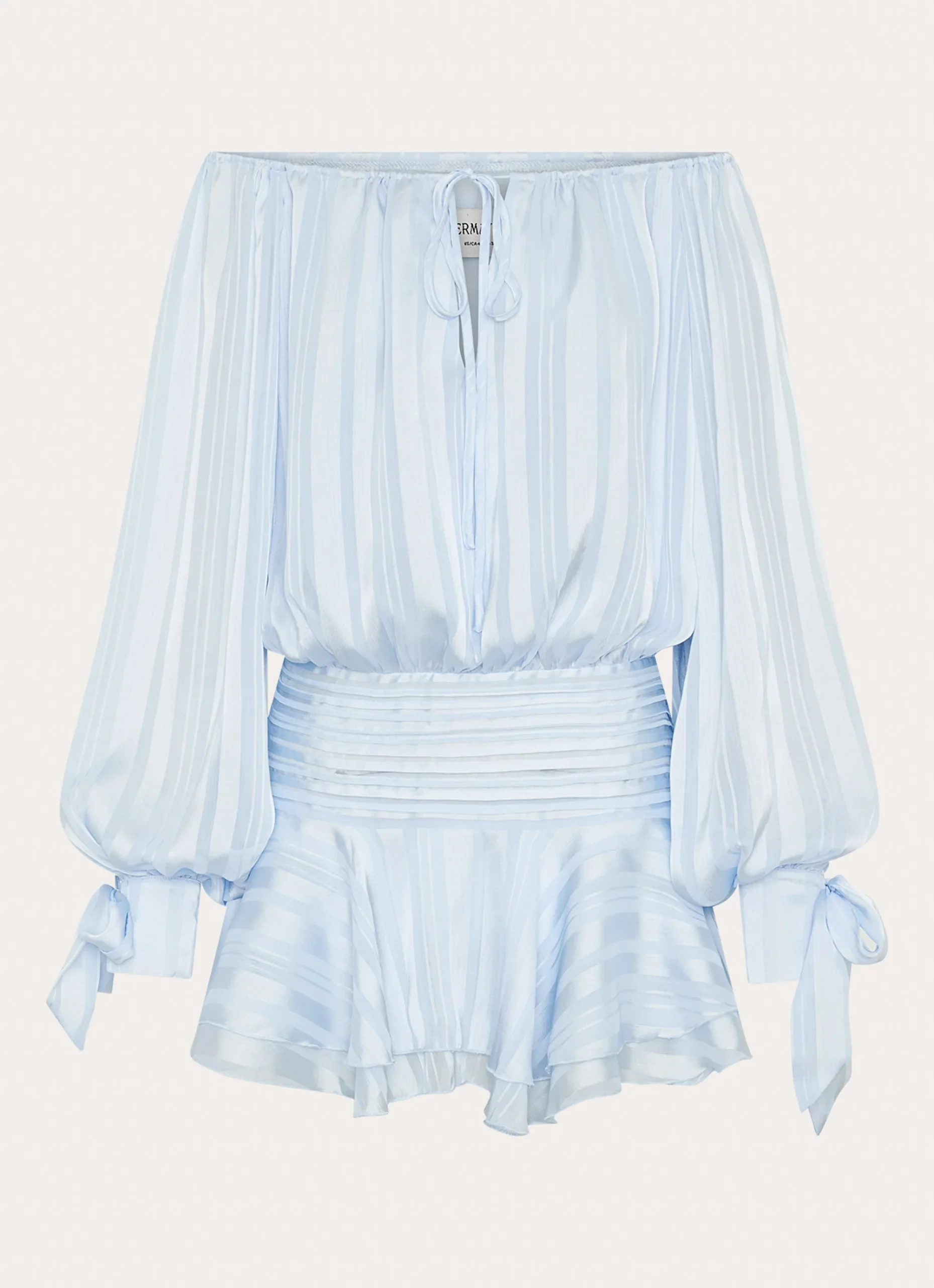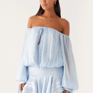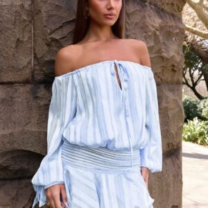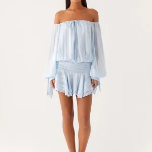 The Eira balloon sleeve mini dress is a playful and flirty choice for warm days and evenings. Featuring an off-the-shoulder design, a tie front, elastic panels, and a fully lined silhouette, this mini dress combines style and comfort. A ruffle hem adds movement and a playful, feminine touch.