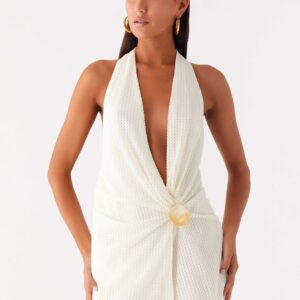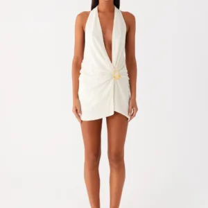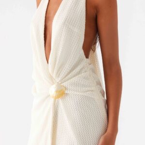 The Eleanora mini dress with a plunging neckline is the perfect choice for sultry evenings. It features a low cowl neckline and an open back with a wide tie at the neck. Gathering at the center front and a lining add texture and depth to this sheer, fully lined dress with a front trim.