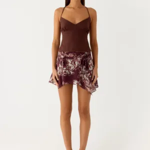 The Fiore asymmetrical mini skirt turns heads with its asymmetrical hem, gathered side details, and figure-flattering stretch knit. Designed to move with you from golden hour to the pulse of nightlife.