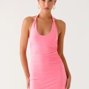 The Fluent mini dress is designed to turn heads with its elegant mini length and scoop neckline. With a stylish halter neck and a bold open back, this dress effortlessly combines sophisticated elegance with a touch of glamour.