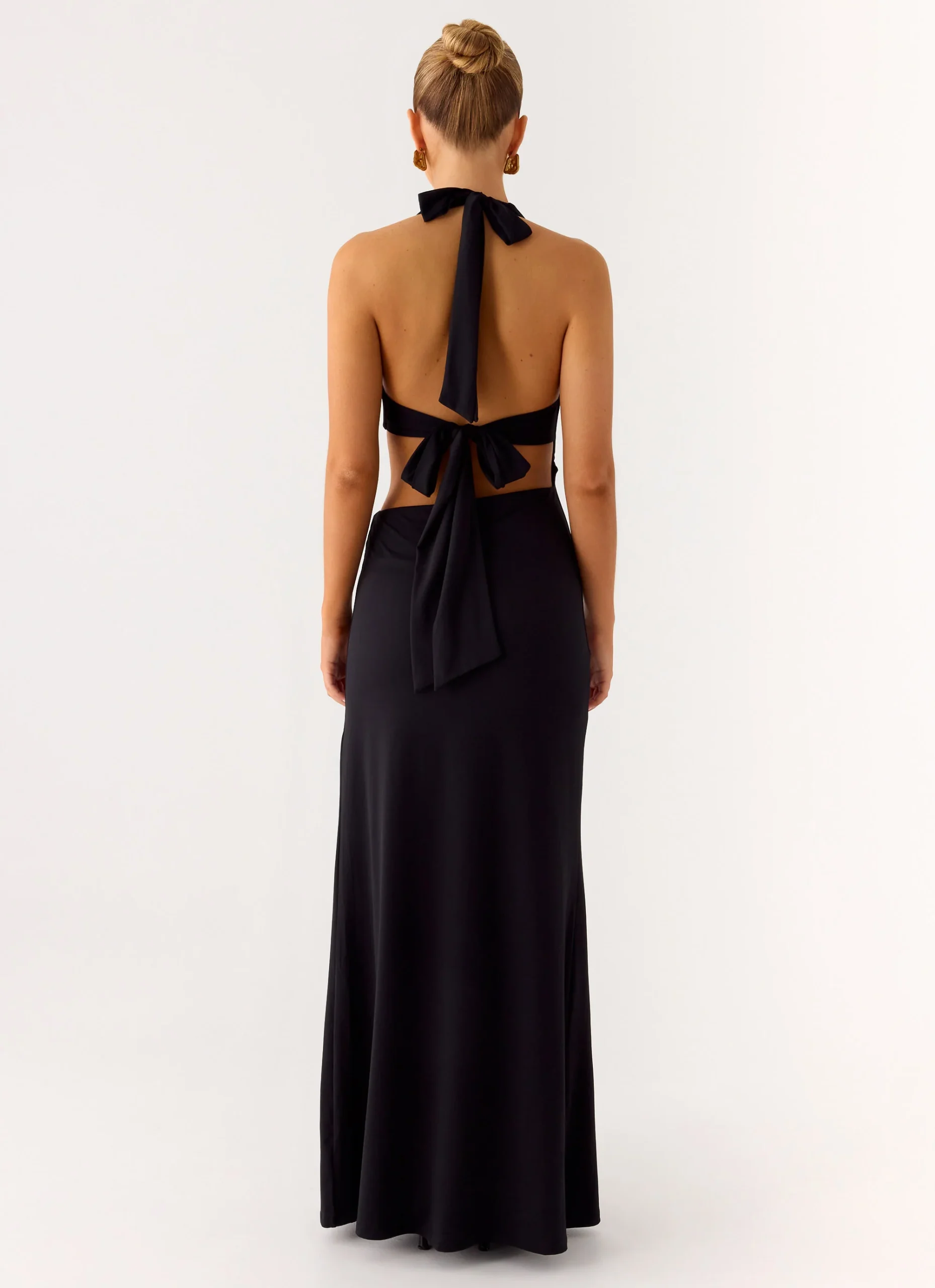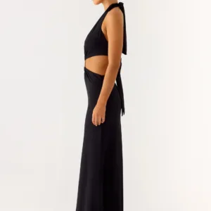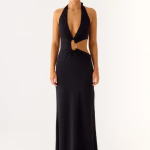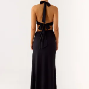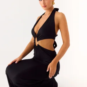 The Free Now Maxi Dress is a stunning outfit for elegant evenings. This fully lined halter neck maxi dress features a deep V-neck and wide ties at the neck and back, combining structure with a fluid silhouette and gold-tone hardware.