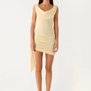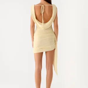 A Peppermayo exclusive, the Good Fortune mini dress features a cowl neck and is perfect for dazzling evenings. Side gathers at the hips and a belt add sophistication, while a low cowl neck with a tie back completes the look with effortless elegance. Crafted from stretch mesh with an exclusive printed lining, this dress is made for warm evenings and city lights.