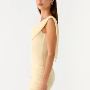 – Low cowl neck at back with tie closure