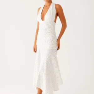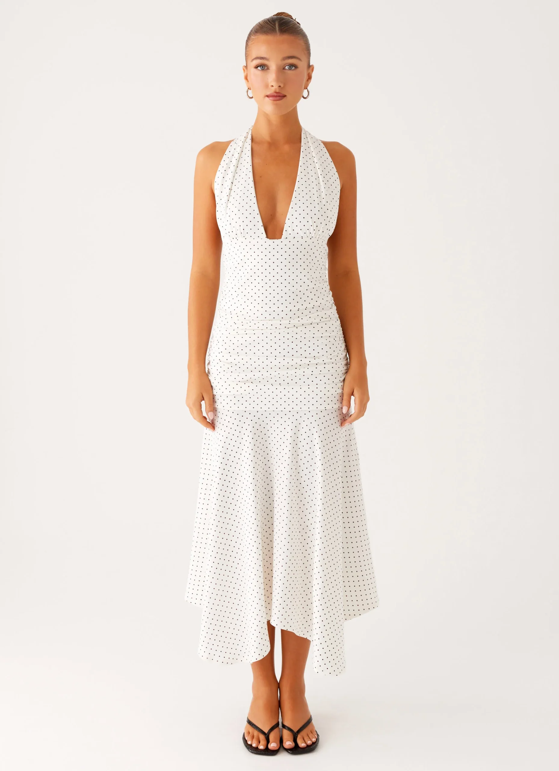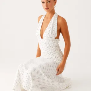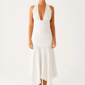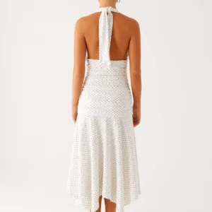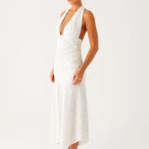 Get into evening wear in the Grettana midi dress, featuring a V-neck, delicate tie detail, open back, and gathered sides. Crafted from stretch knit fabric for a silhouette that will move with you from golden skies to evening vibes.