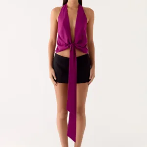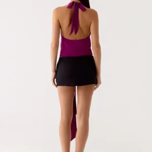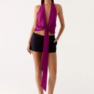 This tie-back top on the right side is designed for style from sunset to evening. This fully lined chiffon top features a halter neck, wide tie front, adjustable draped low back, and side concealed zip for a flattering silhouette perfect for beach nights or city outings.