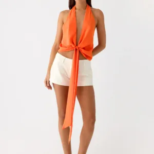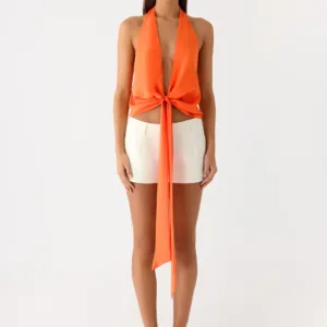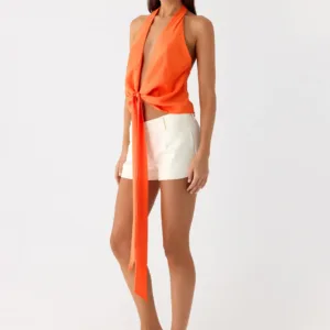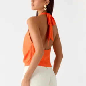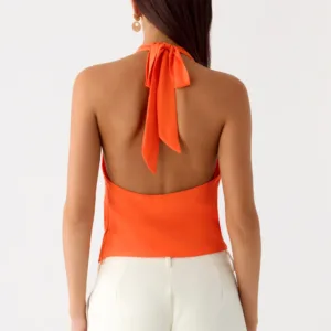 This tie-back top on the right side is designed for style from sunset to evening. This fully lined chiffon top features a halter neck, wide tie front, adjustable draped low back, and side concealed zip for a flattering silhouette perfect for beach nights or city outings.