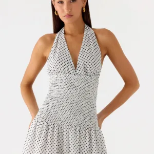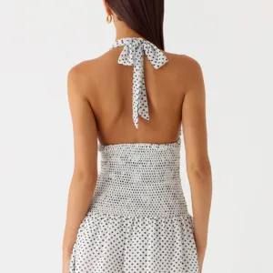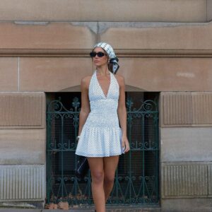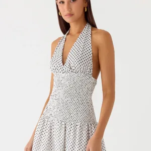 The Holden mini dress exudes sensual sophistication with a striking silhouette. With a deep V-neck, gathered bodice, wide straps and an open back, this mini dress is designed to own the night with every move.