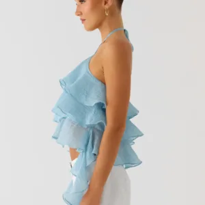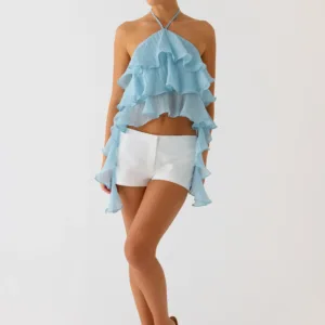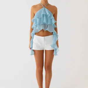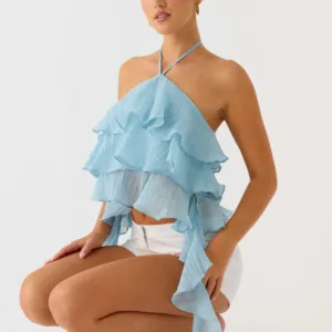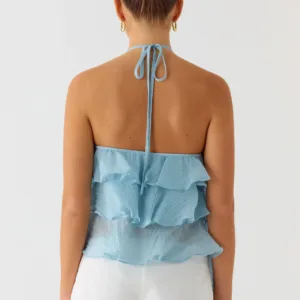 The Inna Frill Halter Top is a playful and flirty addition to your wardrobe. This tiered ruffle dress with an open back is perfect to pair with skirts or shorts for a chic summer look.