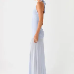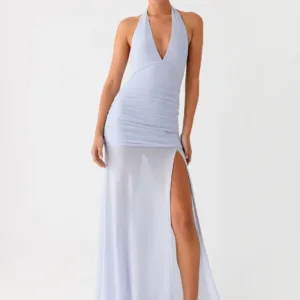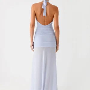 Reveal your island style with the Island Muse Dress in Blue. This stunning maxi dress features a flattering V-neck and ruched sides to flatter your figure. Crafted from breathable stretch mesh, this dress flows effortlessly with every step, while a side slit at the front adds a touch of daring – perfect for those golden hour moments that turn into unforgettable nights.
