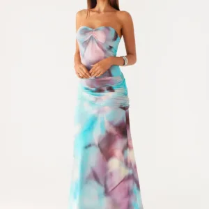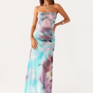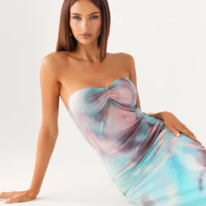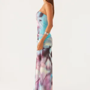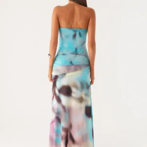 The Isle Escape mesh maxi dress is made for golden hour and beyond. Featuring a strapless bustier and draped detailing, this fitted silhouette is fully lined and features side draping for a flattering silhouette. Made with a gradient print, it’s perfect for the beach or the bar.