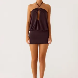 The Jisoo Halter Mini Dress is a stylish halter neck stretch knit mini dress featuring a keyhole neckline, gold-tone hardware, and thin ties for a comfortable, adjustable fit.