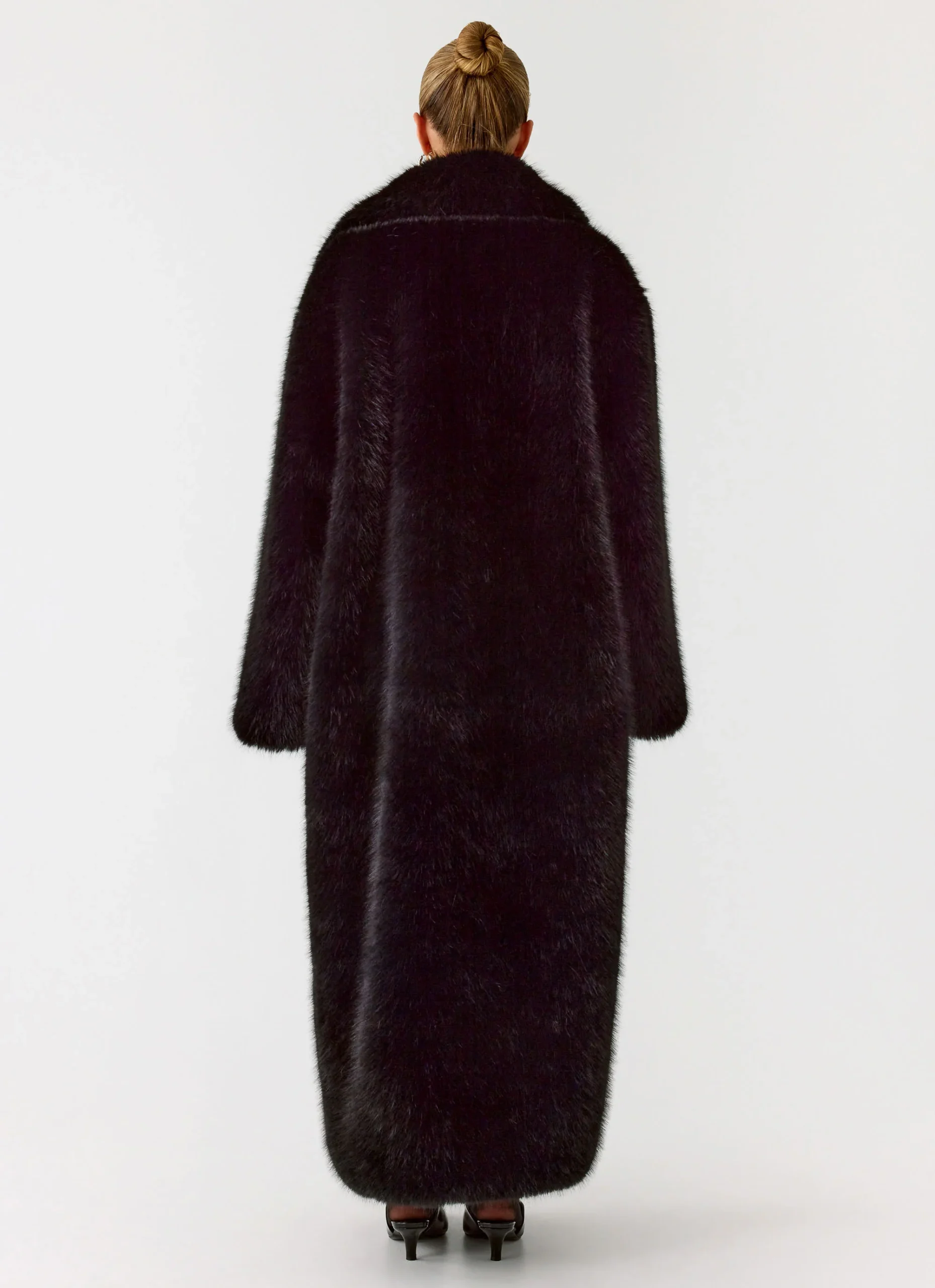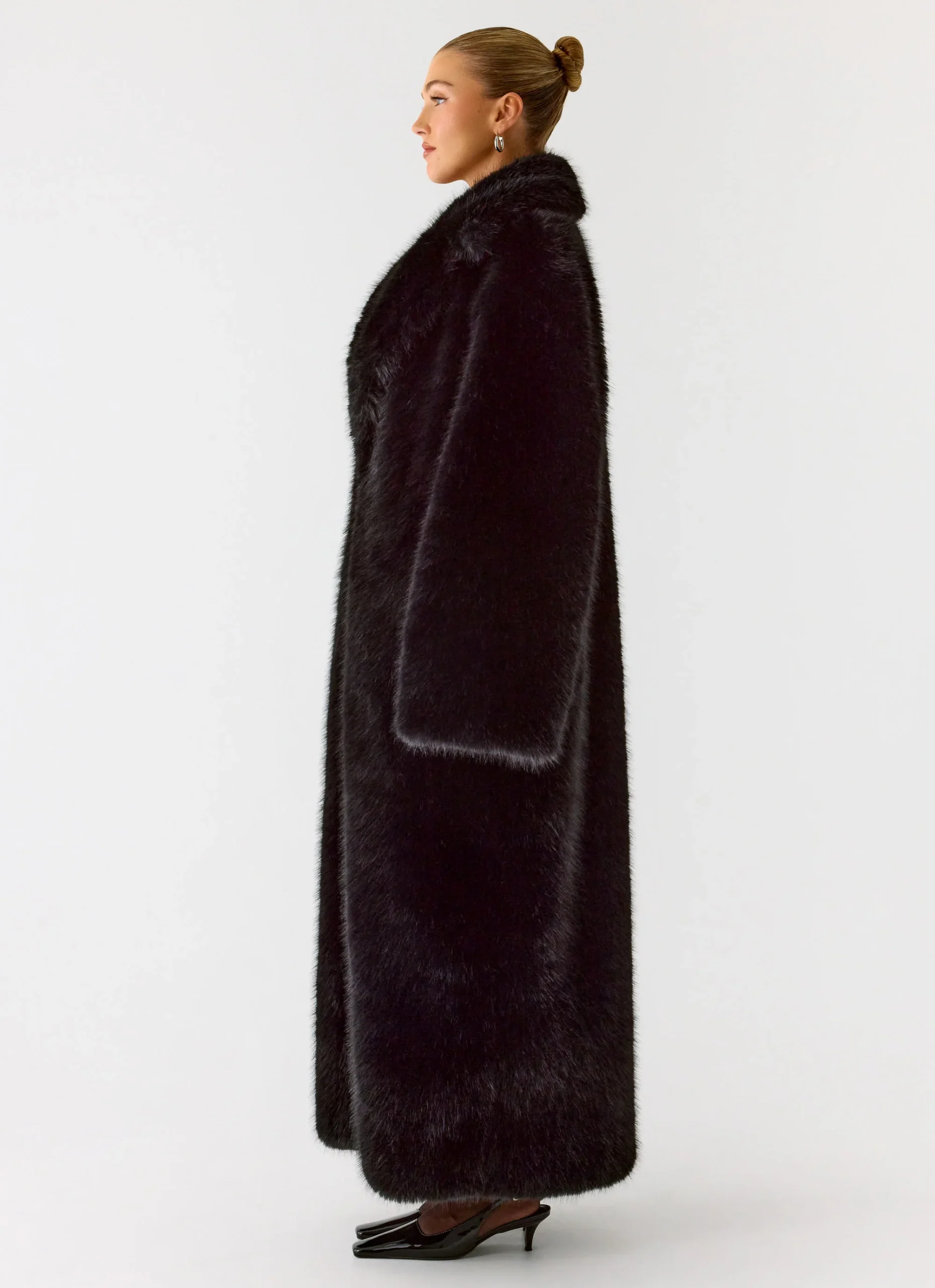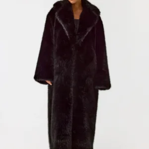 A Peppermayo exclusive, the Kamil faux fur maxi coat is designed for striking winter style. Its relaxed maxi silhouette provides comfort and coverage while maintaining a chic and elegant look. Fully lined for warmth, made from soft faux fur.