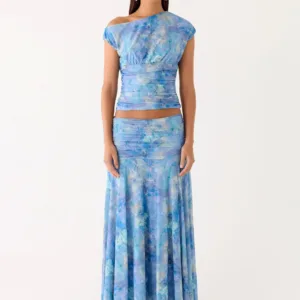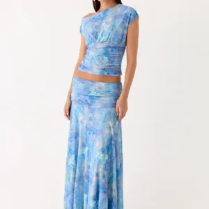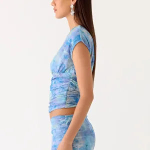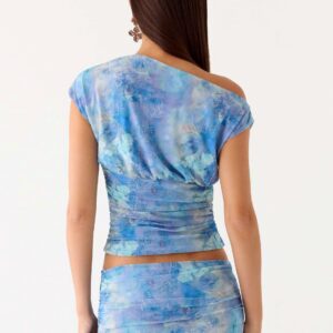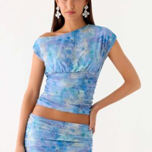 Asymmetrical Liana top with an asymmetrical neckline and gathered waist. Designed for a sleek, fitted silhouette, this striking top will add effortless flair to any evening look.
