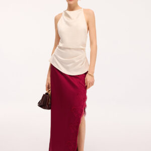 Be the first to review “Long satin skirt with side slit and lace trim”