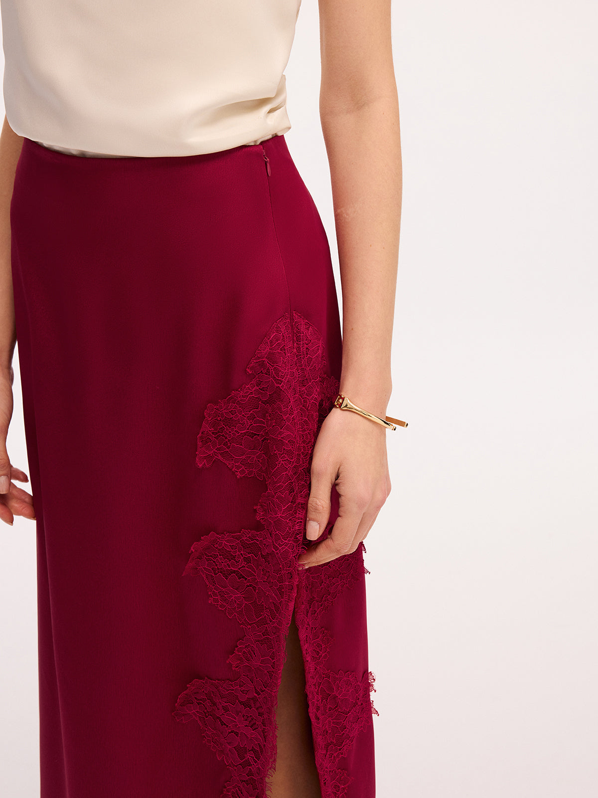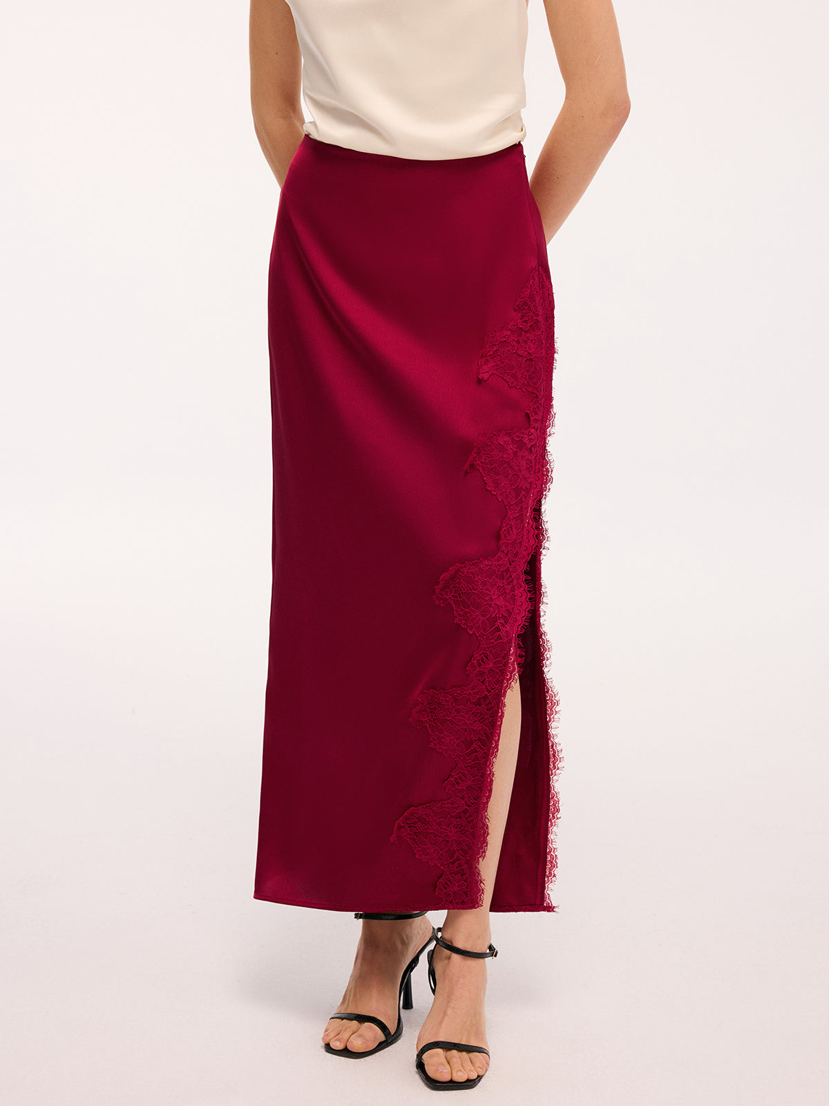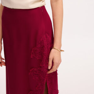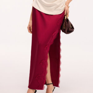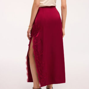 Long satin skirt with side slit and lace trim