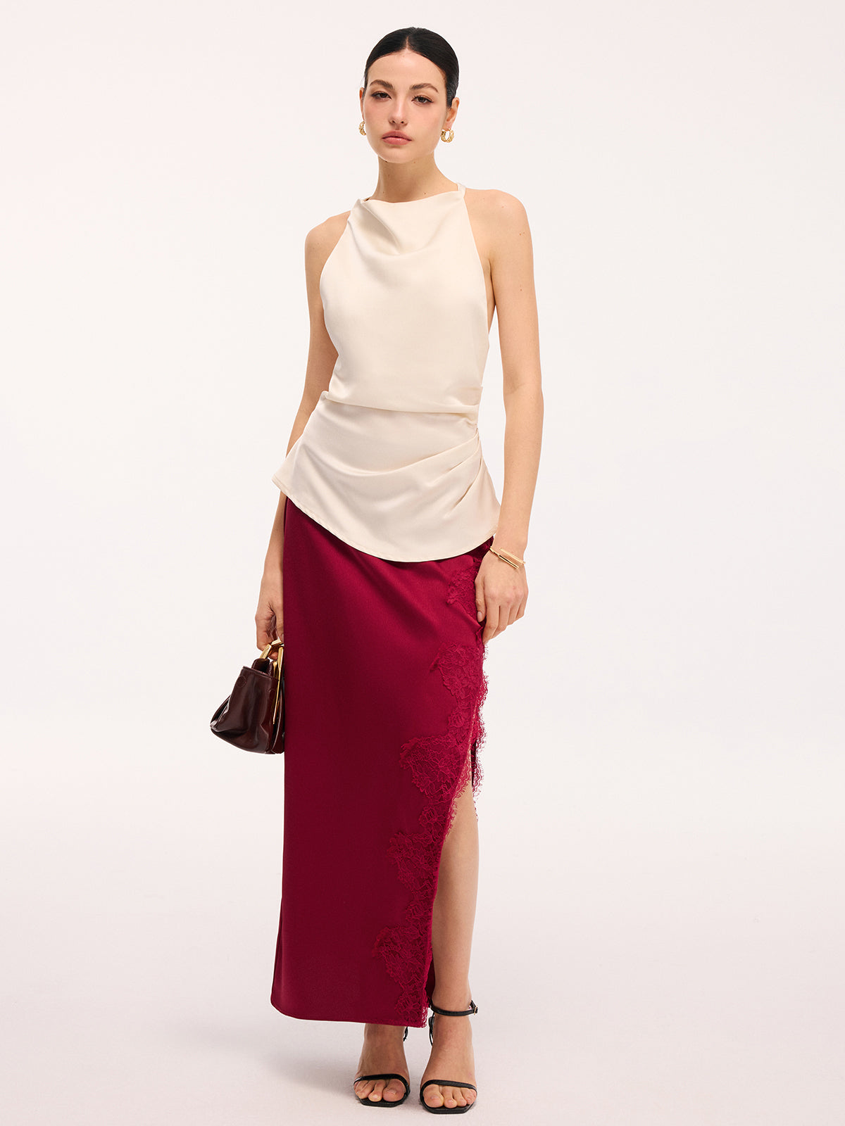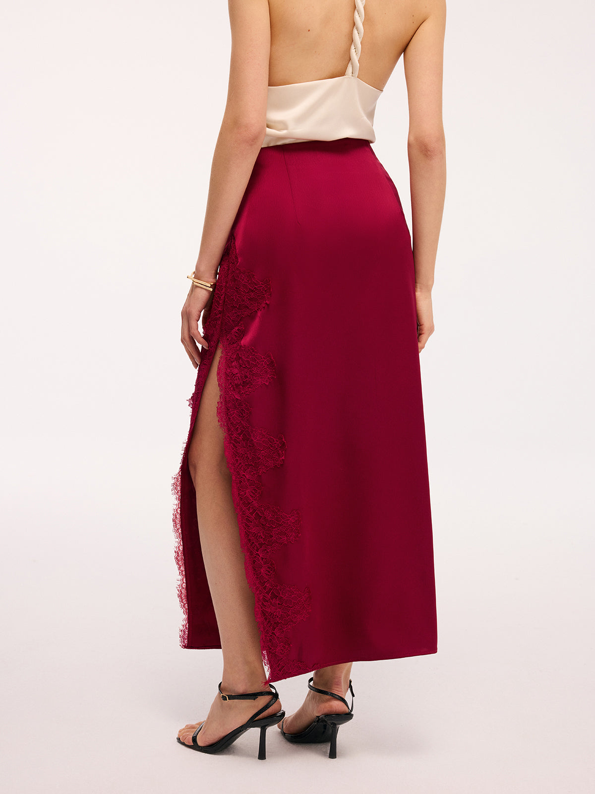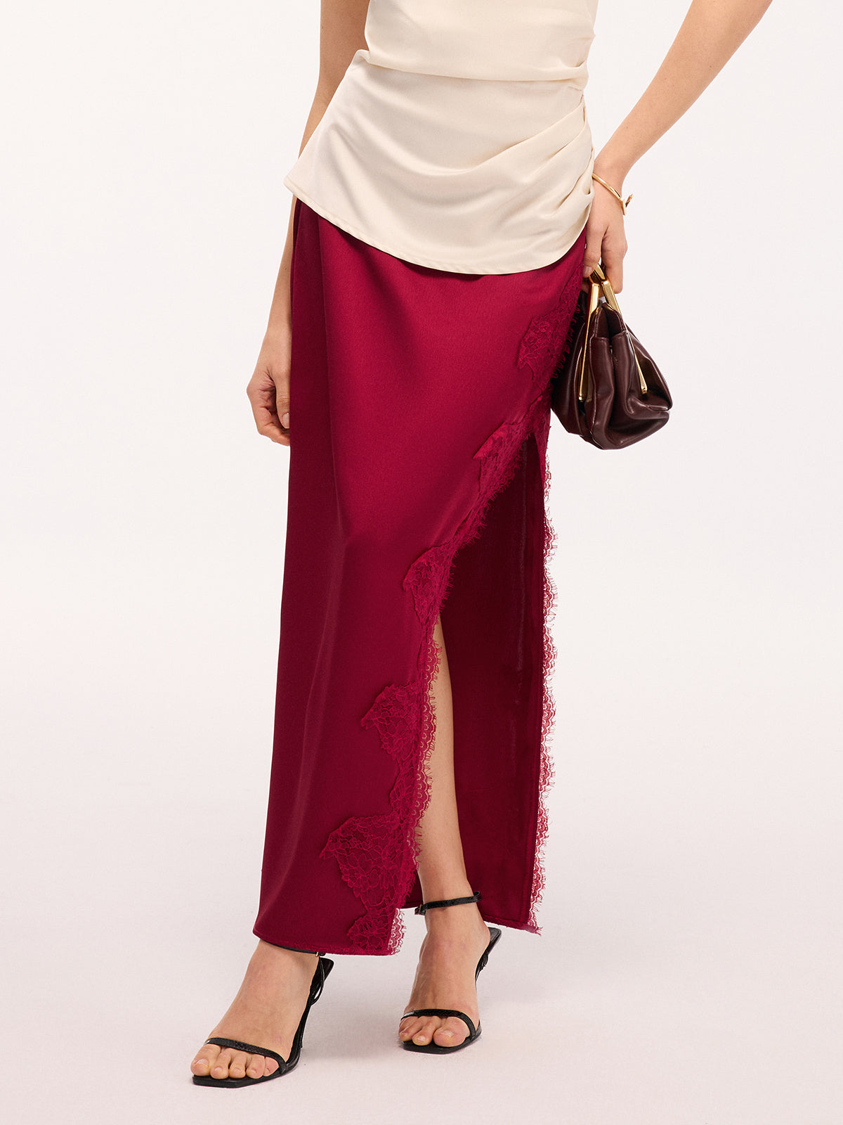 Long satin skirt with side slit and lace trim