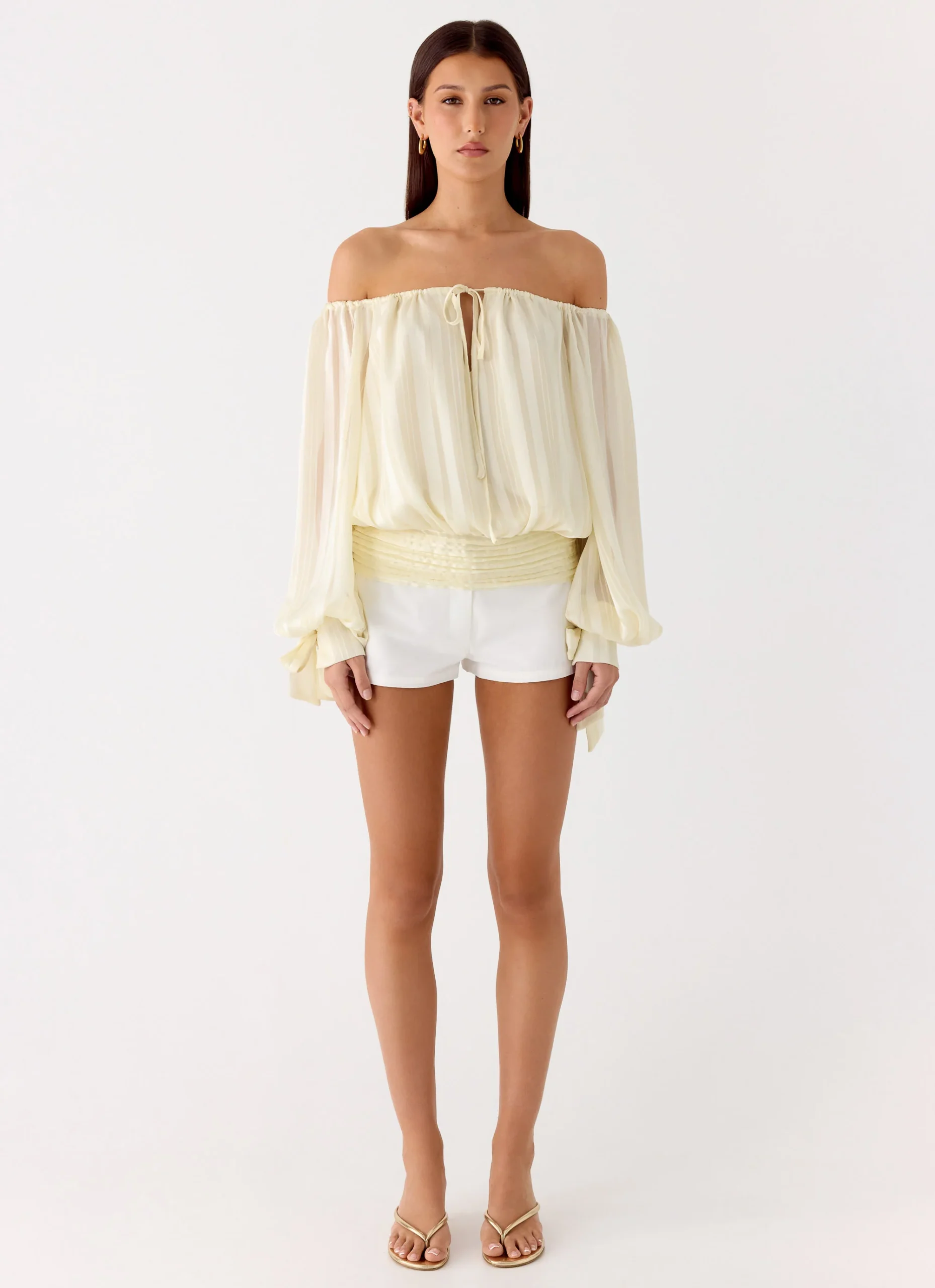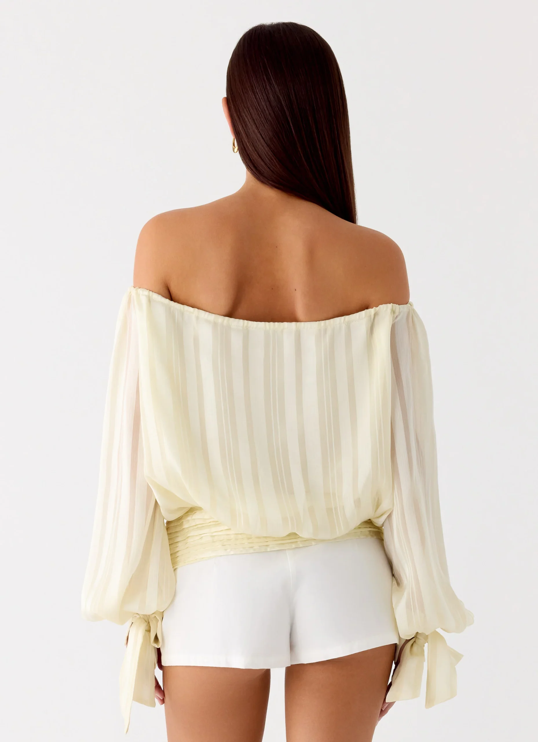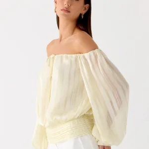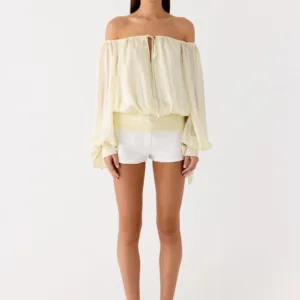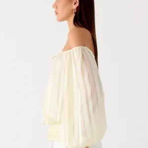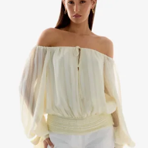 The Coconut Kiss Off-Shoulder Long Sleeve Top is a lightweight and feminine piece designed for effortless style. Featuring an off-shoulder design, tie front closure, and cuffs, it adds a romantic touch to any look. Fully lined for comfort, this chiffon top combines elegance with easy-to-wear comfort.