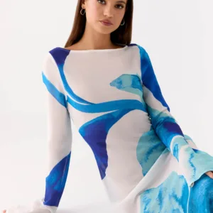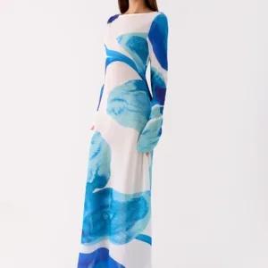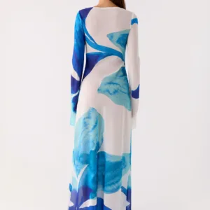 The Lorde maxi dress is the epitome of effortless elegance. This unlined, sheer, boat neck dress is made for golden skies and nights where elegance and mystery meet.