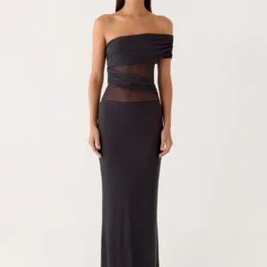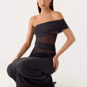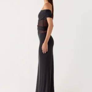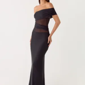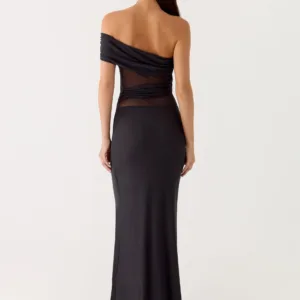The Lumi Maxi Dress makes a bold statement with its off-the-shoulder design and draped detailing at the shoulders and sides. A silicone band ensures a secure fit, while the flowing maxi length creates an elegant look perfect for any evening event.