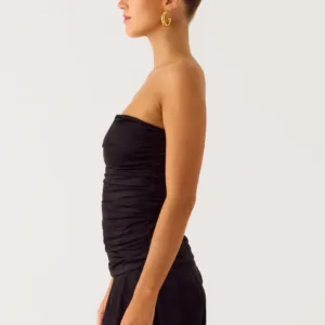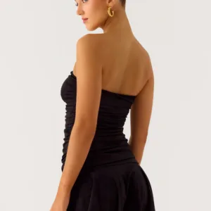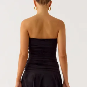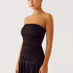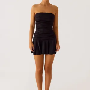 The Meridella Strapless Mini Dress is a chic and striking piece with an open neckline, gathered bodice, and a cinching strap for a secure fit. Designed for petite figures, this fully lined dress is perfect for parties or special occasions.