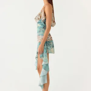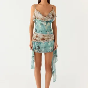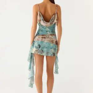 The Meylissa Hanky Mini Dress ??is a playful and feminine mini dress featuring a cowl back, ruffles, and adjustable straps in an exclusive print for a flirty and glamorous look.
