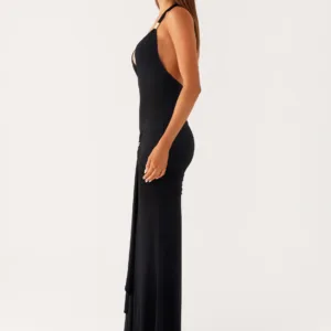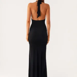 The Miyah Halter Hardware Maxi Dress is a striking, form-fitting dress made for golden hour moments. Crafted from stretch mesh, it features a V-neck with tie closure, a fully lined bustier and skirt, and side pleats for a flattering silhouette. This dress features wide, long straps, gold trim, and an open back for effortless evening glamour.