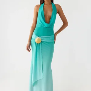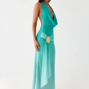 The Paradox Shell Maxi Dress is designed for effortless summer glamour. Featuring a low cowl neck, tie front sash, and delicate shell trim, this fully lined maxi dress cinchs the waist and creates a fluid silhouette perfect for sunset dinners or evenings at the beach.