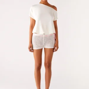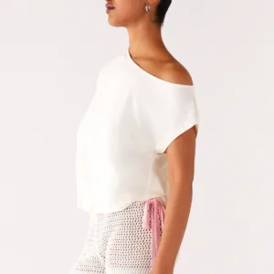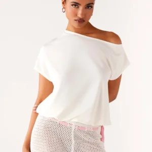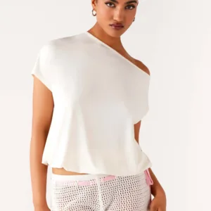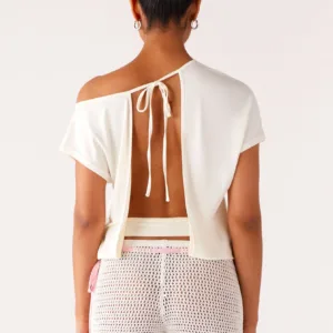 The Raeni off-the-shoulder top is the epitome of elegant evening style. Crafted from soft stretch jersey, it features an open shoulder cutout and a striking low-cut cowl back, finished with a tie at the neck. With a gathered, draped waist and a structured bottom panel, this is one top that speaks for itself.