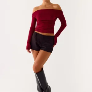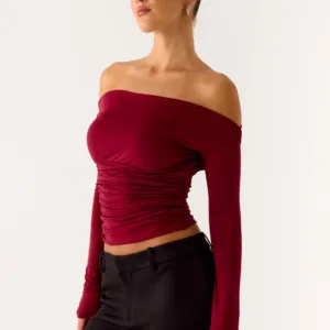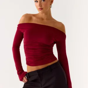 The Reva long sleeve top is designed for elegant casual wear with a touch of charm. The off-shoulder dress features ruched detailing that hugs the body for a soft, stretchy fit. – Open shoulder neckline – Long sleeves – Ruched detailing – Fitted silhouette – Stretch jersey – Fabric composition: 95% polyester, 5% elastane. Size AU 8 / US 4: Bust: 86cm/33.86in Waist: 62cm/24.41in Hem length: 68cm/26.77in Sleeve length: 44.5cm/17.52in Sleeve length: 54cm/21.26in. Yasmin is 174cm tall and wears a size AU 6 / US 2. Zali is 178cm tall and wears a size AU 6 / US 2.