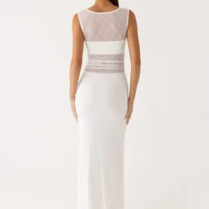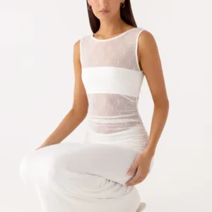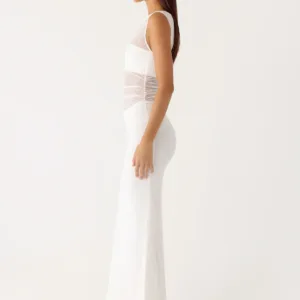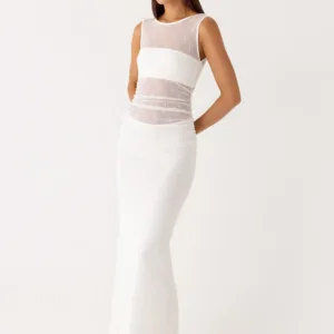 The Sabre Maxi Dress is a sophisticated, body-hugging maxi dress with a sheer bodice and cropped bralette, crafted from stretchy, textured jersey for a flattering fit.