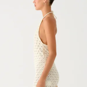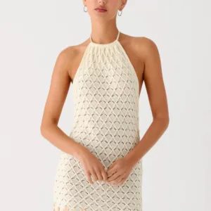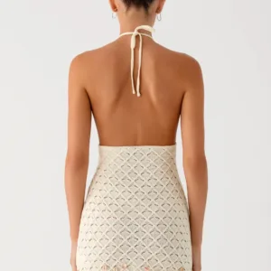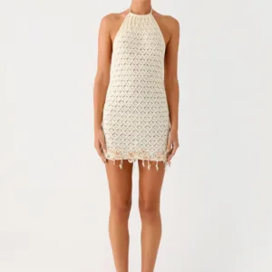 The Shaeson beaded mini dress is a delightful knitted accessory perfect for summer evenings and beach getaways. Crafted from a textured fabric, it features a halter neck, an open back, and a playful hem with shell-inspired fringe. This dress features thin, adjustable straps for a perfect fit.