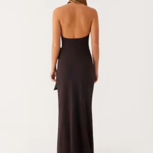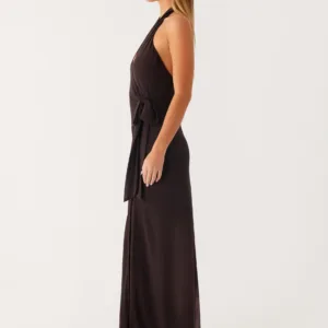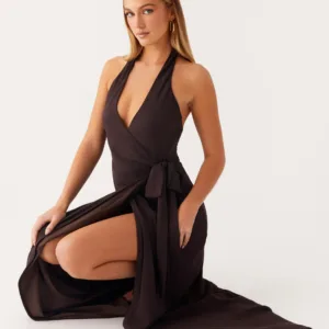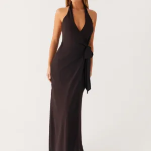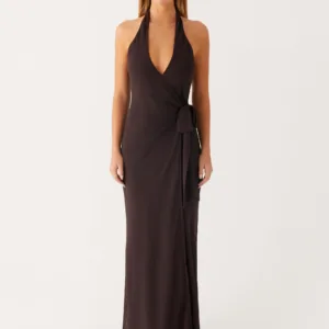 The So Chic maxi dress features a flattering V-neck with a wrap-front and tie-neck detail. Crafted from lightweight chiffon, it features elastic straps, an open back, and a side slit at the front for ease of movement. Fully lined for comfort and an elegant maxi length complete the look.