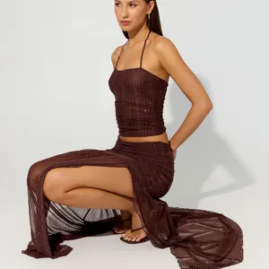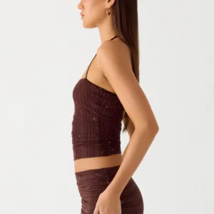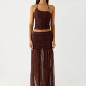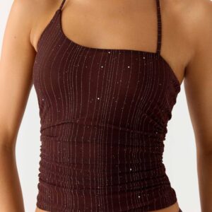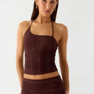 A Peppermayo exclusive, the Sparkling Night top is perfect for evening hours and a sparkling glow. Featuring an asymmetrical neckline and a tie-neck detail, this fully lined top is crafted from shimmering mesh for a flirty and striking look. Pairs perfectly with mini or classic skirts for a look that lasts from sunset to sunset.