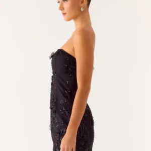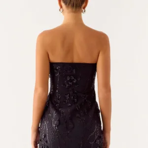 The Wear My Kiss Mini Dress is a stunning strapless, fully lined, beaded mini dress. This concealed zipper dress with fringed hem combines glamour and playful details for a one-of-a-kind look.