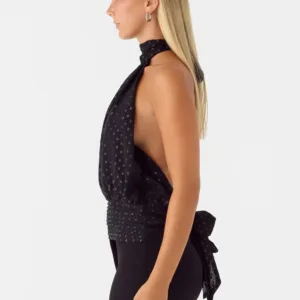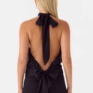 The Willow Chiffon Top embodies evening-ready elegance with its halter neck and wide tie detail. This fully lined, textured chiffon dress features an open back secured with an elegant tie closure – perfect for those golden hour moments that continue well after dark.